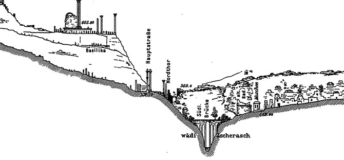 Profile of the ancient city of Gerasa, from east-west, after Schumacher (1902), showing the physical relationship between the River Chrysorrhoas and the city.